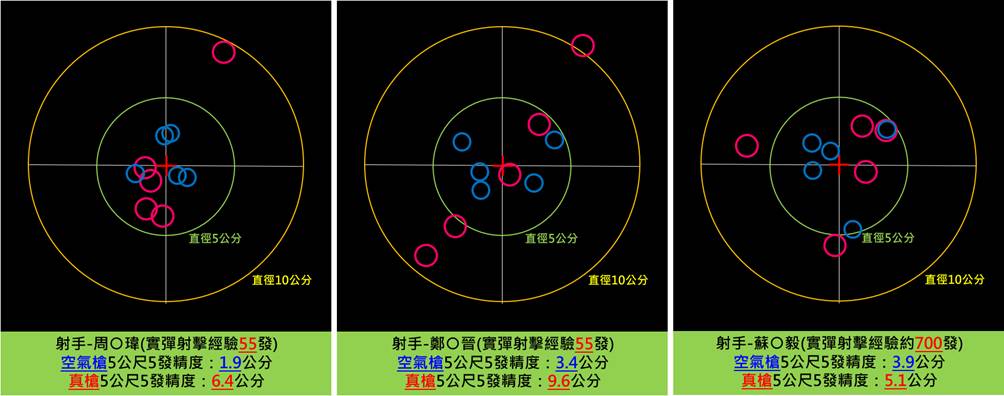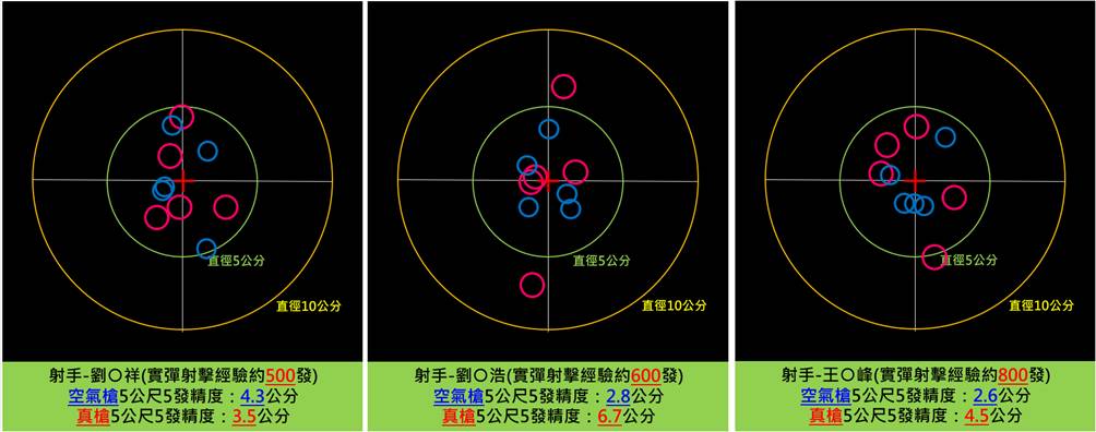 這就是為什麼GBB手槍3-5公尺近距離可以這麼神準,幾乎能瞄哪打哪的原因!然而也有很多生存遊戲玩家都曾在當兵後(或遠赴國外靶場實施實彈射擊),第一次打到真正的手槍時,對眼前自己打出來的彈著位置感到不可置信,不僅準度偏差的很嚴重,連自己最自豪的精度也打不出來,進而產生第一次手槍實彈射擊時強烈的挫敗感… 為了驗證這個論點,我曾找高階射擊班隊資深士官幹部做了GBB手槍與實槍射擊精度差異測試(圖四),先讓射手用立姿在5公尺打5發GBB手槍看精度(測試槍為GPM1911 CP手槍,彈重0.25g),然後再讓每個參與測試的射手隨後拿真槍比照相同模式,再打一群5發彈著,比對前後精度差異來證明(裡頭唯一變因只有槍跟彈),至於為什麼選5公尺,因為5公尺內GBB手槍的彈道幾乎是不會有風偏,精度也比較能打的出來,這樣要跟真槍比精度看差異,個人認為較為公平。